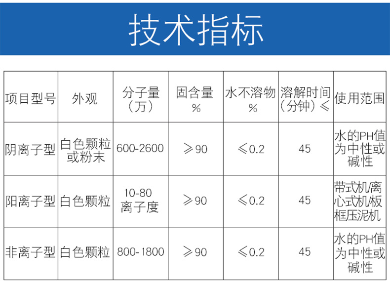 陰離子聚丙烯酰胺:以吸附架橋和卷掃絮凝為主,通過分子鏈上的活性基團(tuán)吸附污水中的懸浮顆粒,形成較大的絮團(tuán),同時利用卷掃作用將周圍的細(xì)小顆粒包裹進(jìn)來,加速沉淀。